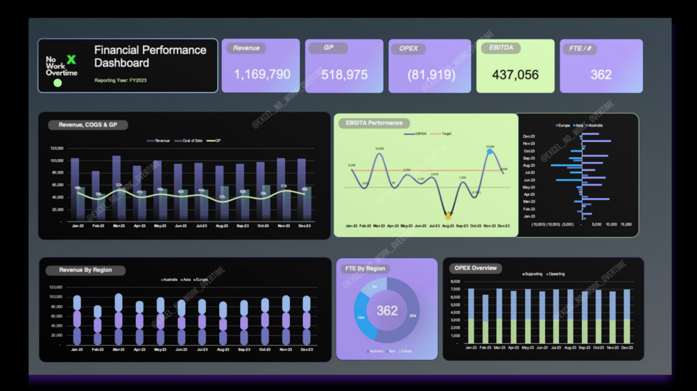 - Regional Insights: Explore EBITDA distribution by region with a horizontal line chart, understand monthly revenue by region through a customized stacked bar chart, and visualize total Full-Time Equivalent (FTE) and FTE distribution by region with a pie chart.